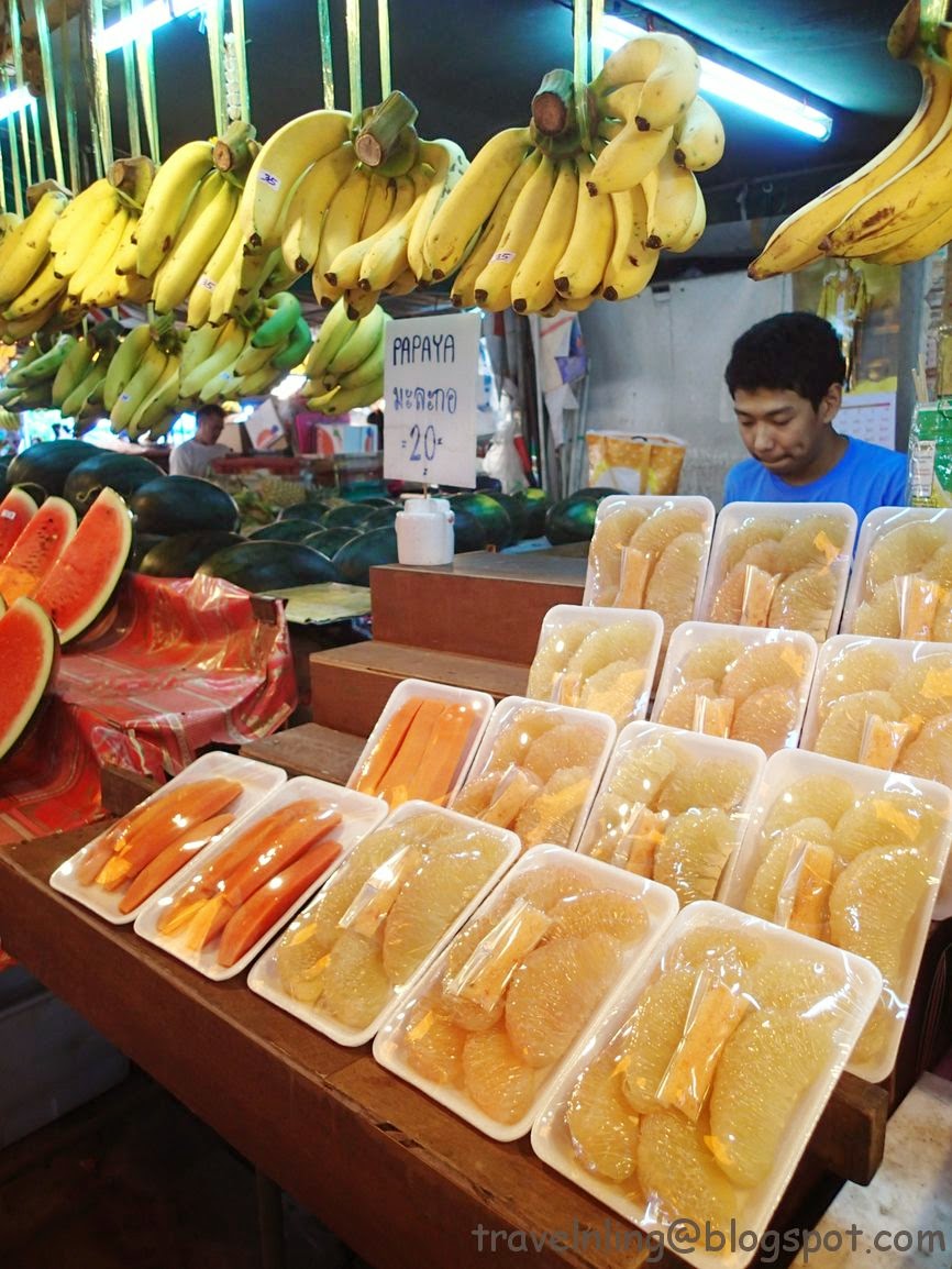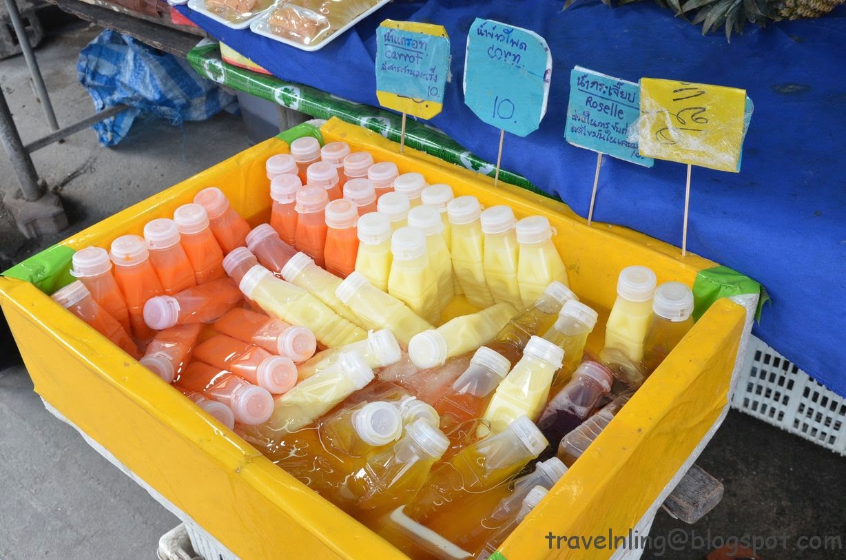 買了瓶甘蔗汁,看見保麗龍外寫著8,以為是8泰銖,結帳時卻是10泰銖,這算是不實廣告嗎?其實這裡的物價比曼谷便宜多了,同樣的瓶裝果汁,在曼谷是兩倍價格,20泰銖。我還曾在臥佛寺前買過40泰銖的果汁,那時心想也許因為是石榴汁所以比較貴一點。