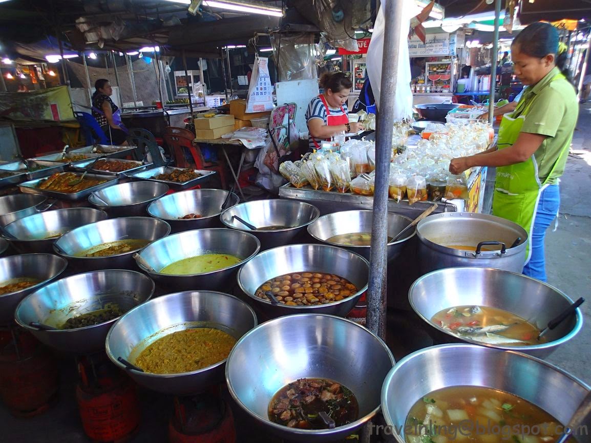 一盆盆大鍋子裡頭裝的是各類菜色,鍋子下方有瓦斯爐溫熱食物,攤商都是用塑膠袋分裝成一小包販售,每包十幾塊不等。當地很多主婦買一、兩包,再買碗飯,淋在飯上便決定了一餐。在泰國,外食族似乎蠻多的!