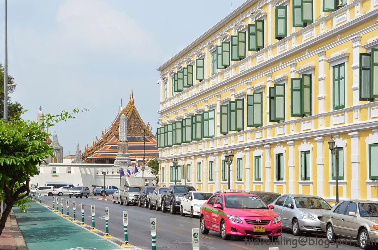 過橋後,兩旁是歐式風格的建築物,這麼洋式風格的建築出現在這裡,我心想大概是飯店旅館之類吧,想不到是國家政府相關機構。說也奇怪,印象中泰國是中南半島上唯一沒有受英法等國殖民的國家,竟也有這樣風格的建築?