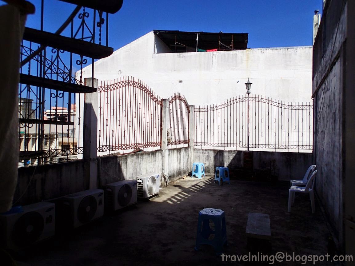 室內全面禁菸,只有三樓陽台開放抽菸。陽台這裡可以曬衣服,望出去就是其他建築物頂樓,沒有什麼風景可言。
