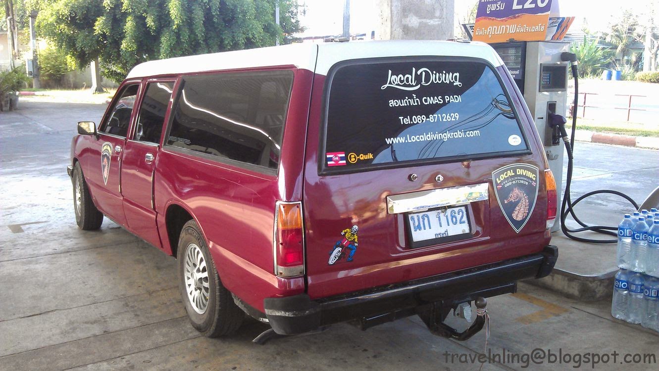 早上退房後,潛店專車八點便在喀比鎮的民宿接我,從喀比鎮到奧南海灘約十六公里,車程近半小時。其他潛店的接送僅限奧南地區,若到喀比鎮上接,單程車資500泰銖。聊天中得知來接我的人是潛店老闆,泰國本地人,潛歷十五年,在很多地方潛水後回到家鄉開業,除了潛店也開了一家酒吧,似乎還有經營其他事業。