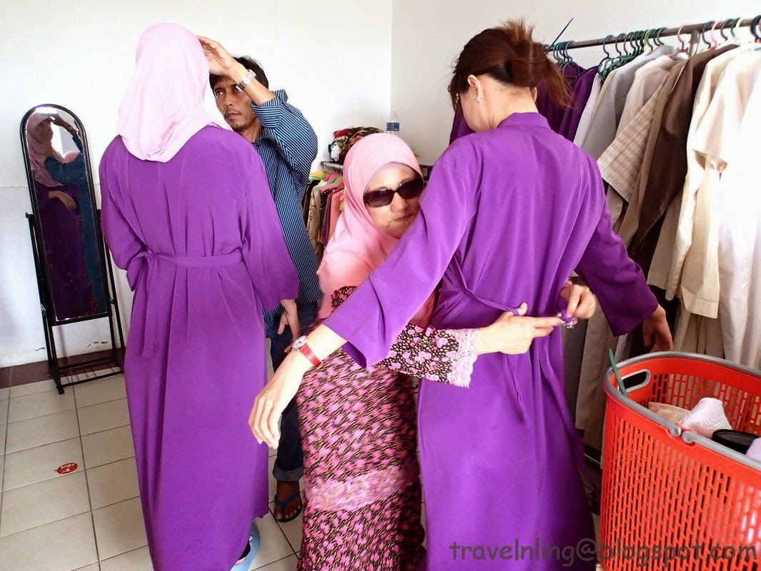 然後到一旁的小更衣室,會有人幫忙換穿衣服。在原本穿的衣服外面再套上一件長袍,頭髮因為不能露出,也得用頭巾包住。據說穆斯林女性的身體髮膚只能讓自己的先生看,所以從小時候起就習慣了這樣頭巾與長袖衣物,包覆住頭髮與手腳四肢,但如果獲得另一半先生允許,就不受這樣的限制。
