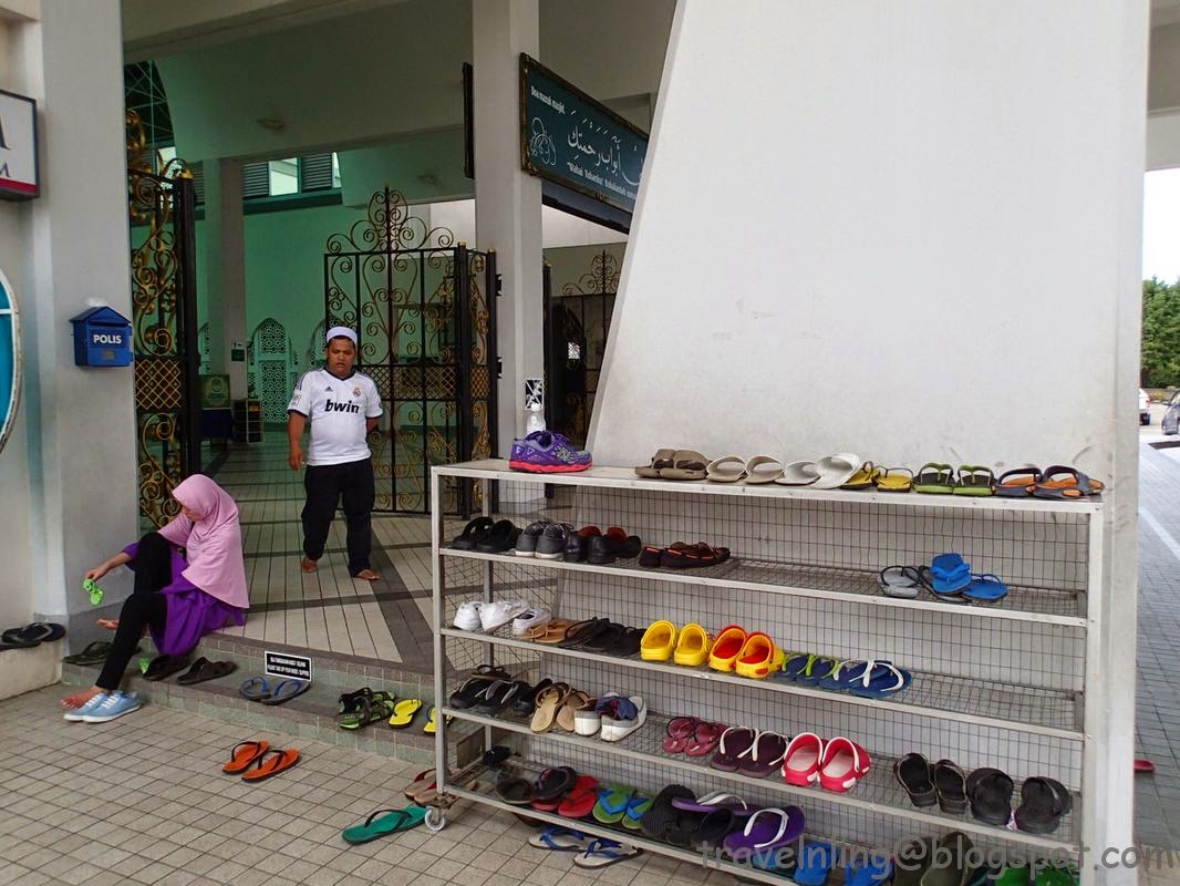 換好後就可以進去清真寺了。清真寺入口處有個置鞋架,訪客必需脫鞋進入。