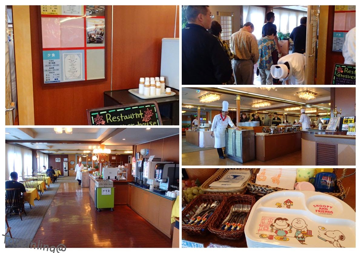 船上的餐廳提供自助式晚餐每人2000日元,自助式早餐每人1000日元,可以現場付費進入。由於晚餐時間是六點至八點,上船安頓好已近七點,加上不便宜也看不見窗外景色,所以我們沒有選用晚餐,只選用早餐,早餐的時間是七點半至九點。晚餐就吃剛剛在等候搭船的便利商店時買的便當跟飯糰。