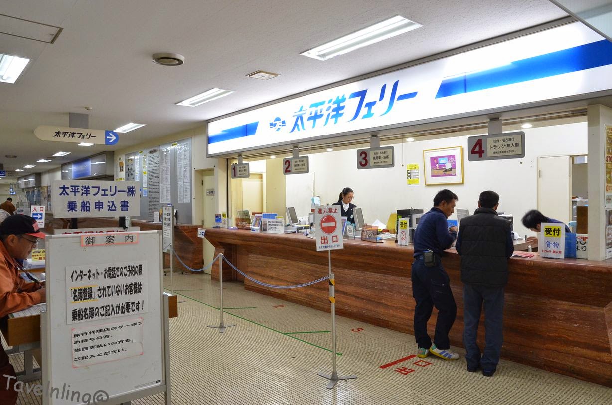 要注意的是,櫃檯前有張桌子請旅客自行拿空白表格填寫搭船乘客全員的姓名資料,若能事先於官網輸入,就不必在現場拿表格填寫,可以節省時間。如果不是旺季,現場再寫也可以,這天由於是平日,只有三三兩兩的旅客。若看不懂日文無法上網預約的旅客,依太平洋郵輪官網的中文網頁(簡體字)資訊,船公司也有提供電話預約的方式,有會中文的服務人員協助預訂的樣子。